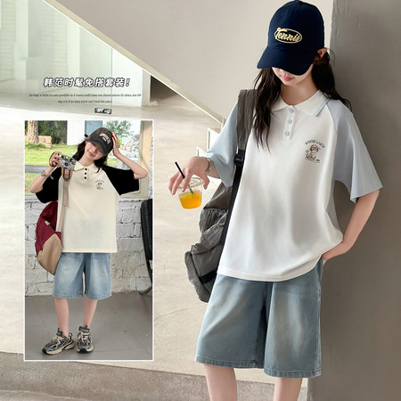 米咔精灵&66077清新小字母T恤牛仔裤套装休闲