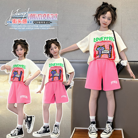 蕊蕊&R253款卡通猫数码印花T恤套装
